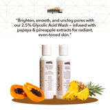 Start your skincare routine with this exceptional exfoliating cleanser. Our Glycolic Acid Wash, featuring 2.5% Glycolic Acid along with Papaya & Pineapple Extracts, helps unclog pores, remove dead skin cells and impurities, and restore your skin's tone and radiance.